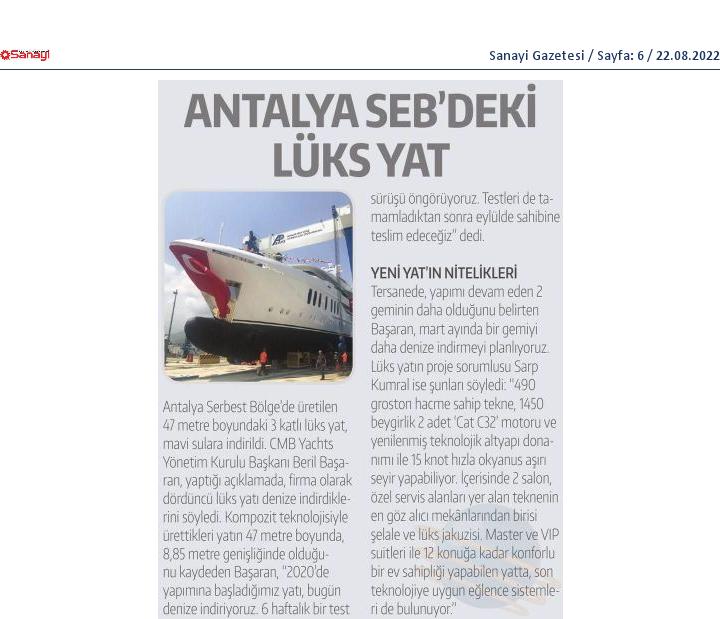 The 47-meter-long, 3-deck luxury yacht produced in the Antalya Free Zone has been launched into the blue waters. Beril Başaran, Chairman of CMB Yachts, announced that this is their fourth luxury yacht launch. Başaran stated that the yacht, produced using composite technology, is 47 meters long and 8.85 meters wide. “We are launching the yacht we started building in 2020 today. We anticipate a 6-week test period. After completing the tests, we will deliver it to the owner in September,” he said.
